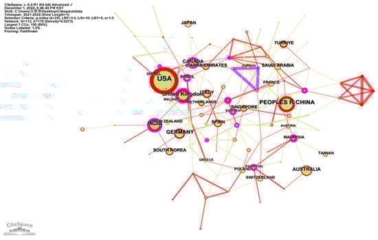 We also performed country/region-based co-authorship network analysis (based on pathfinder network) and generated the collaboration networks as shown in Figure 3. The layout is organized so that countries/regions with strong collaborative relationships will appear near to each other, whereas countries/regions with weak collaboration ties would be placed further away from one another. The nodes indicate countries/territories, while the links among nodes represent the collaborations among countries/territories. The node size revealed the number of publications of the corresponding countries/territories. The pink node edge means that the node has strong betweenness centrality. Betweenness centrality can be illustrated as the number of times a node lies on the shortest path between others []. Concretely, the main findings are as follows. First, the United Kingdom, India, and Spain had the highest degree of betweenness centrality, which means that they play the most significant roles in the overall collaboration network (see Table 5). Second, although Qatar, Argentina, and Nigeria have high betweenness centrality, their number of ChatGPT-related publications is relatively low. Third, in international politics, the countries/regions with a high degree of betweenness centrality may serve as bridges between different political groups, economic alliances, or cultural districts. For example, Qatar is an economic and cultural hub connecting the West and the Middle East.