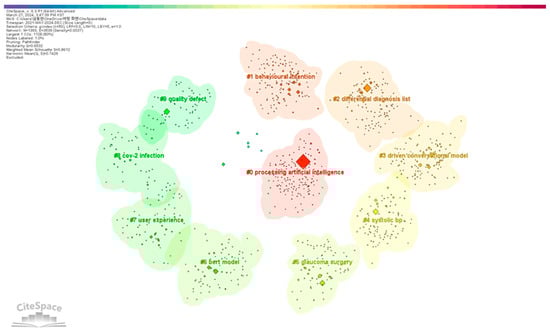 On the basis of the guidelines offered by Zhao et al. [], we found Clusters #0 (processing artificial intelligence; e.g., Aiumtrakul et al. []), Cluster #1 (behavioral intention; e.g., Ma and Huo []; Kopplin et al. []), Cluster #2 (differential diagnosis list; e.g., Abdullahi et al. []; Hirosawa et al. []), to be the most significant in the ChatGPT field (Table 9) owing to their high silhouette values of >0.8, meaning excellent fit [,]. Additionally, these clusters were the largest among the 10 clusters []. Overall, “data processing using ChatGPT” (Cluster #0), “exploring user behavioral intention of ChatGPT” (Cluster #1), “applying ChatGPT for differential diagnosis” (Cluster #2) were found to be significant themes. Ma and Huo [] analyzed survey-based data (n = 500) and found that novelty value and perceived humanness play notable roles in influencing intention to adopt ChatGPT. Hirosawa et al. [] concludes the potential diagnostic accuracy of differential diagnosis lists generated by ChatGPT-3.5 and ChatGPT-4 for complex clinical vignettes derived from case reports in the department of general internal medicine.