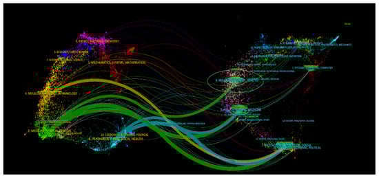 Chen and Leydesdorff [] reported that dual-map overlays can be used to easily determine whether a set of articles has integrated previous works across multiple subjects by tracing citation arcs from the concentrated landing zones of the origin branches. Based on the suggestions made by Zhang et al. [], we generated journal dual-map overlays using CiteSpace (Figure 5) to explore the distribution of ChatGPT-related research knowledge bases. As shown in Figure 5, each node indicates the research subject categorized by CiteSpace based on WoS classifications. The different colors in the map indicate various areas, and the width of the links means the strength of the citation relationship between these fields. Specifically, the left- and right-hand sides show maps of citing and cited journals, respectively. The colorful links between the two maps indicate the cited/citing associations among journals/disciplines. Overall, the dual-map overlay shows that various disciplines have frequently referred to each other. Interestingly, it can be observed that the “Medicine, Medical, Clinical” and “Molecular, Biology, Immunology” disciplines have a strong tendency to refer to “Psychology, Education, Social”. These findings indirectly indicate that ChatGPT research is multidisciplinary.