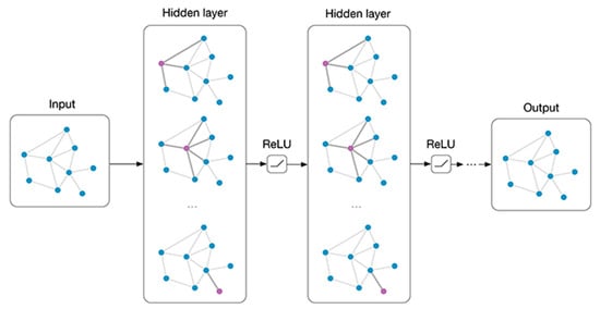 Hence, one can express a hidden layer in the GCN as , where and is a propagation [36]. Every layer matches matrix of features, with each row representing a node’s feature. Each layer combines these features using the propagation rule to create the features of the following layer. With each succeeding layer, features are progressively more abstract. The sole difference between GCN variants in this framework is the propagation rule that is selected [36].