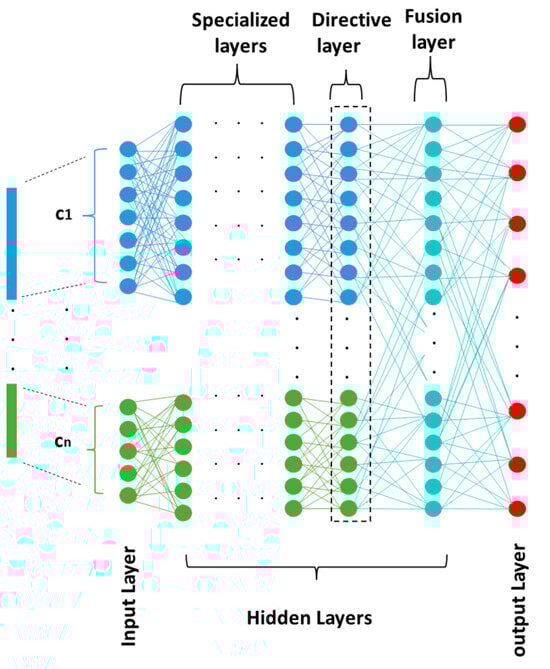 • Directive layer: The suggested architecture consists of a single directive layer. The left side is only partially bonded, while the other side is entirely connected. This layer allows the control of error propagation by considering the two groups of neurons for the specialized levels.