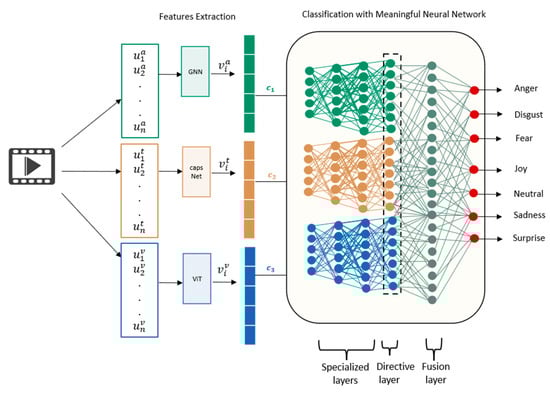 Our work presents a novel method for meaningful multimodal emotion recognition based on capsule graph transformer networks, inspired by these methodologies. First, we create unimodal representations. A graph convolutional network, a capsule network, and a vision transformer, respectively, condense the extracted audio, text, and video representations. When audio is processed using GCN, good information complementarity is produced using hidden representations. The dynamic routing technique of a capsule network in text can efficiently decrease data redundancy, while the use of ViT in video can result in better modeling capabilities. Secondly, the previously extracted representations are fed to the MNN [16,17] to classify emotions. Its architecture is notable for significant learning, making it an excellent fit for our system. Computer-based multimodal emotion recognition is regarded as a fully developed technique. These cutting-edge applications span various fields, including online education. Bao et al. [18] developed a technique for recognizing emotions in a MOOC learning environment based on eye movements and audiovisual features. Another application domain concerns healthcare. In this study [19], the authors provided a survey on multimodal emotion recognition for neural network-based healthcare monitoring systems. Another example in the field of multimodal emotion recognition pertains to the automotive sector; Kumar et al. [20] created a method based on audiovisual elements and eye movements to identify emotions in a MOOC learning environment.