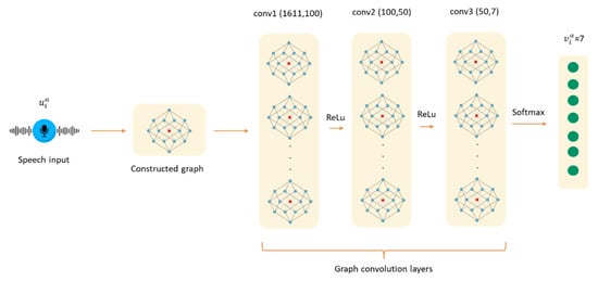 Due to the acoustic signal (utterance = 1611 features), the first step is to construct a corresponding graph , where is the collection of nodes, while is the collection of every point between the nodes. The matrix of adjacency of is denoted by , where an element denotes the edge weight connecting and . The three convolutional layers that make up the GCN architecture are conv1 (1611,100), conv2 (100,50), and conv3 (50,7), with the first parameter referring to the features and the second to the hidden layer. ReLu’s function is applied between the graph convolution layers. Finally, the input is the graph representation, upon which the softmax activation function is applied. The acoustic vector has a length of 7. Therefore, the node representation is calculated as follows: