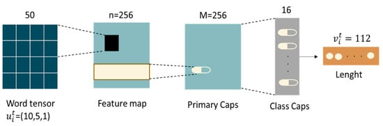 Our method focuses on the encoder component of the capsule network (CapsNet), where the input tensor has a shape of (5,10,5,1) with a batch size of 5. Each example in the modality text dataset has 50 features, which we reshape into a tensor with a shape of (10,5,1) to match the network’s input shape. A convolution-based feature map makes up the second layer with a fixed stride of 1 and a kernel size of with filters. The following layer is named PrimaryCaps, a layer of convolutional capsules featuring a convolutional capsule channel with dimensions and a kernel size of . The final layer is the text capsule layer, also referred to as the DigitCaps layer (7,16), where is the coupling coefficient and Wij is the weight matrix. The compression activation function, , compresses the vector to obtain its module length, , by compression. To acquire the local eigenvector , the entire dynamic routing process is iterated times. Applying the formulas from (2) to (7) yields the calculation technique, where is updated and is updated via a dynamic route, with ’s starting value set to 0 (200 epochs).