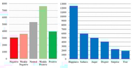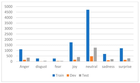 MELD: The Multimodal EmotionLines Dataset (MELD) is an enhanced and enlarged version of the EmotionLines dataset. In addition to text, MELD offers visual and audio modalities, and it shares EmotionLines’ dialogue instances. Moreover, 13,000 utterances and roughly 1400 lines from the Friends television series—which features multiple speakers—are included in the collection. Each sentence is associated with one of seven emotions: neutral, surprise, fear, anger, disgust, sadness, joy, or neutral. Moreover, MELD assigns a mood (positive, negative, or neutral) to every statement. Figure 10 illustrates the emotion distribution in the MELD dataset.