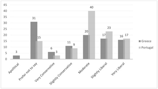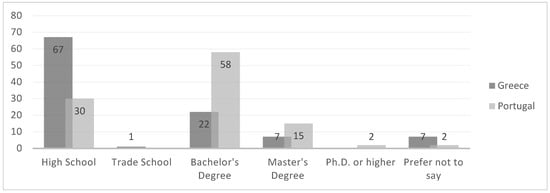 The analysis indicates that there are notable differences in the distribution of educational levels between Greeks and Portuguese (Figure 3). There is a higher percentage of Portuguese respondents with a Bachelor’s Degree, while there is a higher percentage of Greek responders with a High School education. Analysis of the Mann–Whitney U test shows that there is indeed statistically significant difference between the responders’ education by country.