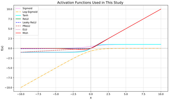 The activation functions used in this study are ReLU, Leaky ReLU, PreLU, ELU, Log-Sigmoid, Mish, Tanh, and sigmoid (Figure 5).