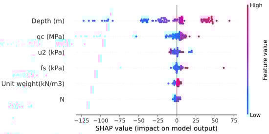 SHAP plots for the features in Figure 9 are ranked according to their contribution to the model. Thus, it can be understood which variables are more critical for the model. Red dots represent high values, and blue dots represent low values. The topmost feature, depth, has the largest impact on the model’s prediction. And N has the lowest impact on the model’s prediction.