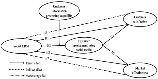 Customer information processing capability can be understood as a component of a firm’s ability to obtain as well as distribute customer information and its ability to use that information efficiently []. Due to the wide availability of customer data today, this capability becomes critical for firms to harness the knowledge of their customers and thereby generate tangible value. In the context of SCRM, customer information processing capability is deemed the most important variable in moderating the relationship between SCRM and customer involvement. Some scholars employed the dynamic capabilities theory in their research on social media, CRM, and firm performance to improve the comprehension of these variables []. Dynamic capabilities theory postulates that in order for a firm to be successful over the long run, it requires capabilities that can assist it in adapting to change.