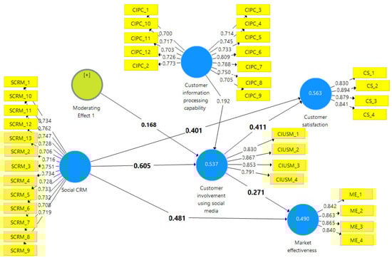 Fifthly, the current findings proved that CIPC significantly moderates the association between the SCRM and CIUSM, supporting H8 and objective 3. CIPC is then demonstrated to improve the efficiency of SCRM as well as help firms decipher and apply customer data for deeper customer engagement. This moderating role is in line with the prior work stressing the importance of information processing capabilities in enhancing a firm’s attentiveness to customers’ needs and wants that in turn create significant interaction through social media websites [,]. The moderating role of CIPC enables organizations to conduct management of an influx of big of social media data, deriving insights that make customer engagement more purposeful and effective. Also, a strong CIPC can enable organizations to enhance their products and services after the integration of customer feedback effectively []. This ability not merely enhances a firm’s innovation capabilities but also engulfs a more customer-centric strategic approach, thus resulting in active engagement of customers, within the social media sites. Fostering a customer-oriented SCRM strategy, CIPC enables firms to practically respond and improve client services, based on their feedback []. Therefore, customers’ feedback goes hand-in-hand with improvements in service platforms [,].