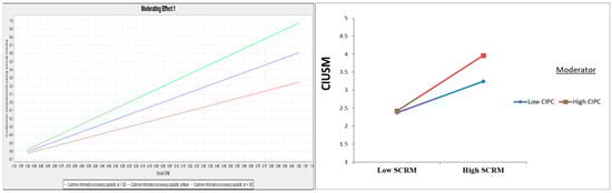 Additionally, the assessment of the moderating effects, according to Table 3 and Figure 3, revealed that the CIPC strengthens the significant influence of SCRM on CIUSM (β = 0.168, t = 4.053, and p = 0.000), indicating support for H8.