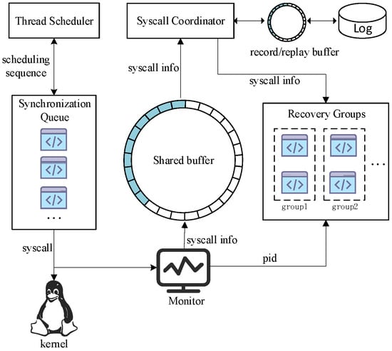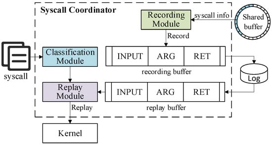 - We design an SSC for an MVX system that supports state recovery of variants through a record–replay mechanism. The SSC consists of a recording module, a classification module, and a replay module. These components are responsible for recording system calls that are validated through a voting process during the synchronized execution phase, and for their deterministic replay during the state recovery phase.