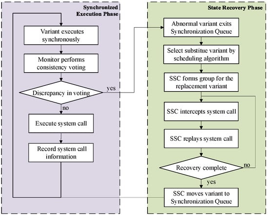 - We design a synchronization and voting algorithm for dynamically managing the synchronized execution queue during the synchronized execution phase. When the voting results are consistent, the algorithm triggers the SSC’s recording module to record system calls. In the case of divergence, the abnormal variant is removed from the Synchronization Queue and terminated. A new successor is then instantiated and assigned to the SSC for state recovery.