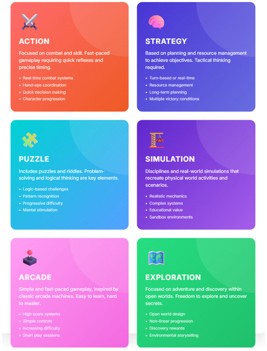 The genre of video games available today is vast and diverse. This phenomenon is due to the continuous growth and advancement of society, which gives rise to new lifestyles and behaviours, reflected and explored in video games. There is a functional classification of the most played titles into six major genre categories: (1) action, focused on combat and skill; (2) strategy, based on planning and resource management to achieve objectives; (3) puzzle, which includes puzzles and riddles; (4) disciplines and real-world simulations, which recreate physical world activities; (5) arcade, characterised by simple and fast gameplay, with easy-to-understand controls; and (6) exploration, focused on adventure and discovery of open worlds []. Preferences vary by player profile: casual gamers prioritise accessible, low-demand games for relaxation, whereas hardcore gamers prefer higher difficulty and longer sessions (Figure 1).
