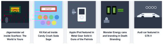 Video games have emerged as one of the largest entertainment industries worldwide. They attract audiences across all ages and genders, establishing themselves as a mainstream medium []. Ref. [] proposes analysing video games as a distinct medium. They recommend examining video games separately from economic or sociological frameworks by focusing on their unique temporal, spatial, and narrative dimensions. Systematic academic research on video games as a communication medium began in the 1980s. At that time, the first advergames and adverworlds were integrated into arcade machines. Arcade machines are recreational video game devices with integrated computers, typically installed in public venues and operated by coins or tokens [,,]. Root Beer Tapper by Budweiser, beer brand, (launched in 1984) is an early example of advergaming. Developed by Marvin Glass and Associates and released by Bally Midway, this game features gamers acting as bartenders serving customers their beers and collecting empty mugs and tips [].