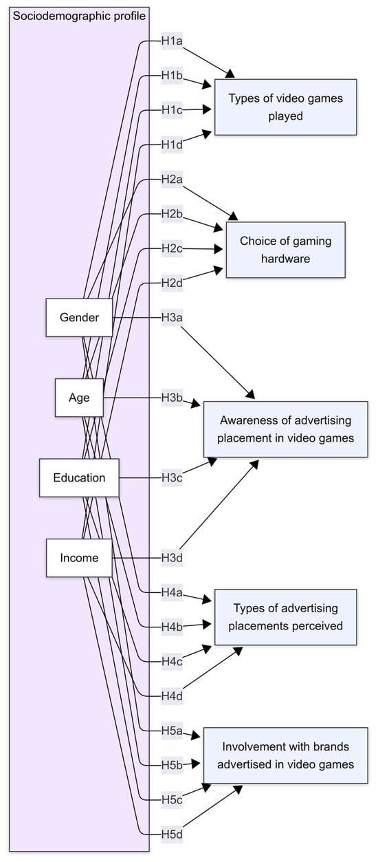 Figure 4 presents the conceptual framework of the study, which illustrates the hypothesised relationships between sociodemographic variables (gender, age, education and income) and five outcome constructs: types of video games played, choice of gaming hardware, awareness of advertising placement, types of advertising placements perceived and involvement with brands advertised in video games.