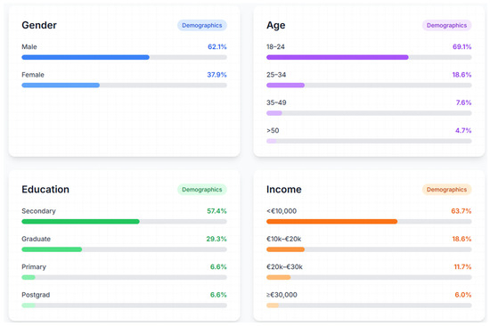 Gaming hardware choices are primarily influenced by age and income, while gender and education have no significant effects. Consistent with prior research [], the preference of 18–24-year-olds for specific devices highlights the generational dimension of hardware choice. Similarly, ref. [] suggested a link between income and device use; our evidence reinforces this relationship by showing that players with incomes below 10,000 € rely on a wider range of hardware. Together, these results complement earlier studies [,], highlighting that hardware preferences are not only generational but also conditioned by economic constraints. This was supported by ANOVA results for both age and income, although post hoc tests did not reveal pairwise differences. By contrast, age and income results were reported in raw counts (i.e., number of devices used), facilitating interpretation in absolute terms.
