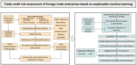 Unlike financial institutions, where credit risk often stems from insolvency, risks in foreign trade enterprises are more frequently associated with subjective behaviors such as misreporting or evasion in trade-related activities. As a result, their credibility is not determined solely by financial performance [2], but it is also influenced by organizational stability, regulatory compliance, and their capacity to adapt to the dynamics of global trade. These complexities make risk classification particularly challenging, as misclassifying high-risk enterprises as low-risk can result in disproportionately severe economic and regulatory consequences. Accordingly, the research problem addressed in this study is how to design a machine learning-based framework that can provide reliable classification of foreign trade enterprises, minimize the costs of misclassification, and deliver interpretable results that support transparent and fair supervision. Unlike most existing studies that mainly concentrate on the financial and banking sectors, this research focuses on credit risk assessment for foreign trade enterprises, a field that remains relatively underexplored despite its practical importance. Furthermore, while previous studies often employ a single interpretability method, we propose a unified multi-dimensional interpretability framework that integrates SHAP and LIME, thereby combining global feature importance with local instance-level explanations. In addition, unlike earlier models that overlook the asymmetric costs of misclassification, this study incorporates loss preferences into the LightGBM model and further enhances its robustness with a Bagging ensemble strategy. Finally, our model is validated using both third-party enterprise data and official customs datasets, which ensures a more comprehensive and reliable empirical evaluation. The main innovative contributions of this study can be listed as follows: