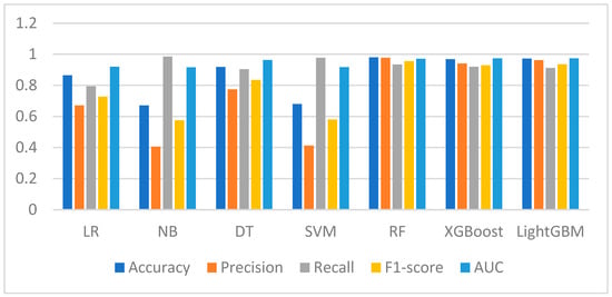The performance of each classification model is shown in Table 2 and Figure 3. From the performance metrics of various models, Random Forest (RF), LightGBM, and XGBoost significantly outperform other models across most indicators, forming a clear hierarchy of performance advantage. RF has the highest accuracy (0.980), F1 score (0.955), and Area Under Curve (AUC) value (0.971), demonstrating a strong comprehensive discriminative ability; LightGBM and XGBoost follow closely with accuracy rates of 0.972 and 0.968, respectively, and AUC values of 0.973, indicating their robustness in identifying high-risk enterprises.