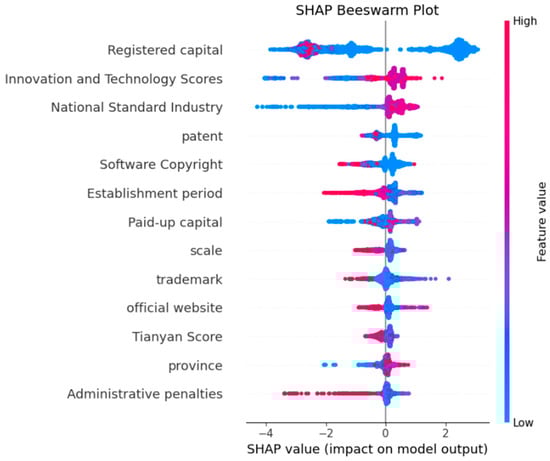 Figure 4 presents the Beeswarm plot of SHAP values for various features in the model, used to analyze the impact of features on credit risk prediction. The horizontal axis represents the distribution of SHAP values, with each feature consisting of multiple points, where the colors range from blue (low feature values) to red (high feature values). A positive SHAP value indicates that the feature prompts the model to make a ‘high-risk’ judgment, while a negative SHAP value suggests that the feature leans towards a ‘low-risk’ prediction. From the figure, it can be seen that ‘registered capital’ is the feature that most significantly affects the model’s predictions, indicating that this feature has strong discriminative power in distinguishing between high and low credit risk enterprises. Companies with high registered capital significantly reduce the probability of being predicted as high-risk, whereas low registered capital is strongly associated with high risk. Generally, a company’s registered capital can reflect its operational scale. A larger registered capital often implies a more stable business condition and relatively lower credit risk. An increase in the number of patents and software copyrights can also lower the probability of high risk.