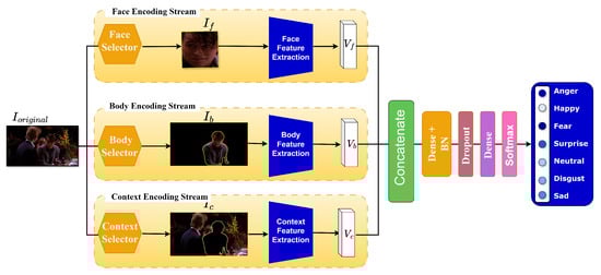 According to our proposed architecture, before final classification, it is necessary to combine the three features extracted using the three encoding streams, as shown in Figure 1; the facial features vector , the body features vector , and the context features vector are concatenated in a single vector shown in (14) and then used as input to the two dense layers; then, the Softmax layer is used to obtain the final classification.