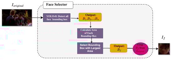 To address this, we first apply YOLOv8m_200e, an intermediate version of YOLOv8 [40] trained for 200 epochs. The model effectively identifies and localizes faces in complex scenes within the NCAER-S dataset, which includes multiple people, varying light conditions, angles, and occlusions. It generates bounding boxes around the detected faces, denoted by for , where N is the number of detected faces in the image. We assume that the face of the main actor is the one with the largest bounding box. The area is calculated using Equation (1) once the index of the face with the largest area is found, based on Equation (2). We use this index to retrieve the corresponding bounding box using (3). This bounding box is then used to extract the face region from the original image , as shown in (4). Finally, we associate the extracted face with the scene’s emotion annotation. The overall process of detecting and extracting the main actor’s face is illustrated in Figure 2.