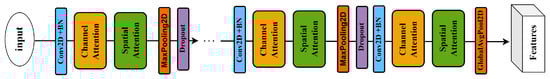 The CBAM architecture operates by sequentially applying channel attention and spatial attention modules. It first applies channel attention to the input feature map, denoted as F, to refine features based on their importance. The channel attention map is computed by first applying average pooling and maximum pooling operations on the input feature map F to obtain two feature vectors. These vectors are then passed through a multi-layer perceptron (MLP) [41]. Finally, the outputs of the and are summed using element-wise summation, and the Sigmoid activation function is applied to this sum to normalize the values to a range between 0 and 1. In short, the channel attention is computed as follows: