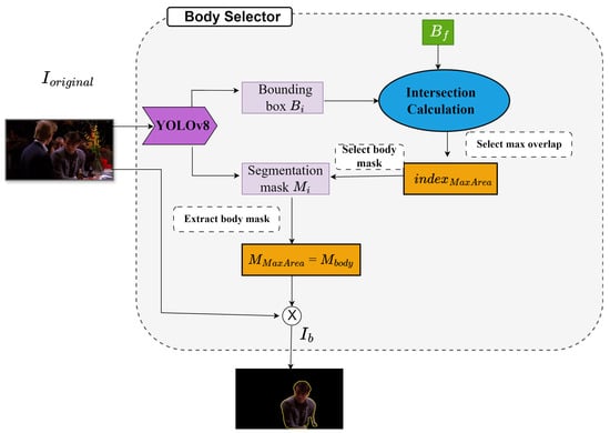 As can be seen in Figure 2, once the main actor’s face with bounding box was identified, we moved on to extract their body. We used YOLOv8 [40] to detect and segment the bodies in the image , with each having its own bounding box expressed using Equation (9). Each bounding box is defined by the coordinates of its top-left corner and its width and height.