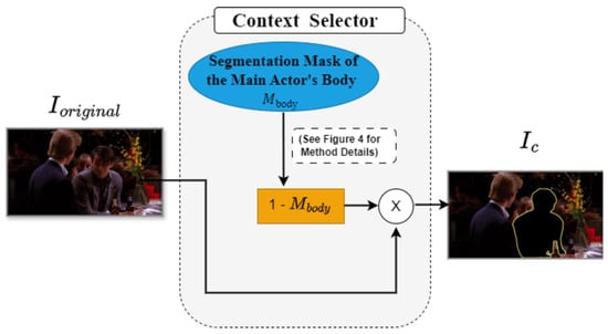 Figure 6 illustrates the procedure for generating the context image used in our model. To extract the context image, we utilized the previously obtained segmentation mask of the body of the primary actor. The segmented body region was then blacked out in the original image, which can be expressed mathematically as follows:
