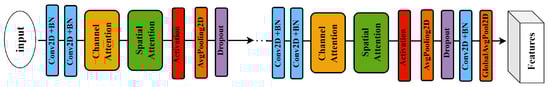 Next, the architecture applies spatial attention to emphasize key regions in the image. The spatial attention map is computed by first applying average pooling and maximum pooling operations to the feature map . Then, the two pooled feature maps are concatenated and a convolution operation with a 7 × 7 kernel is applied. Finally, the Sigmoid activation function is applied to the result to normalize the values to a range between 0 and 1. The specific calculation formula is as follows: