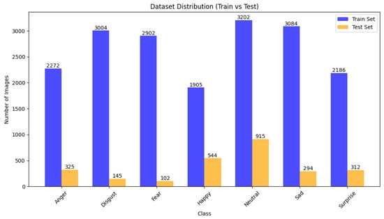 The following figure represents the distribution of images for each category in NCAER-S dataset. We can observe that the emotion “Neutral” has the highest number of data and “Happy” has the lowest amount of data. We can see from Figure 8 that the original NCAER-S dataset is unbalanced, and some classes have very few images. Also, some test set classes contain less than 10 percent of the total dataset, which makes evaluation unreliable. To fix this, we merged the training, validation, and test sets, then split the dataset again to allocate 10 percent of the total images to the test set. This ensured a sufficient number of evaluation samples but did not fully resolve the imbalance across emotion categories. To mitigate this limitation, we applied data augmentation to the face, body, and context images. After resizing each image to 112 × 112 pixels, we introduced variability by performing random horizontal flipping, which generates mirrored views of body, context, and facial orientations to account for natural variations in posture and head direction, brightness adjustments (up to a maximum delta of 0.1) to emulate different lighting conditions, and contrast adjustments (within a range of 0.9–1.1) to capture variations in visual intensity. These transformations enriched the underrepresented classes while preserving their emotional content. Figure 9 presents the new dataset distribution after this change.