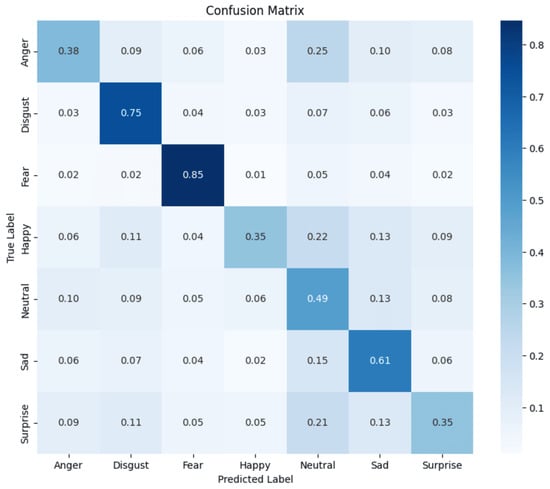 Another experiment focused on addressing class imbalances using focal loss. We observed that its use resulted in a more rapid decrease in loss compared to the standard cross-entropy loss function. This behavior is primarily due to the inherent characteristics of focal loss [44], which places greater emphasis on hard-to-classify examples while downweighting easy ones. In contrast, standard cross-entropy loss, which is used in most existing work in the field of emotion recognition [18,29,47], treats all examples equally. This can cause the model to converge slower, especially when it is confident about easy examples.