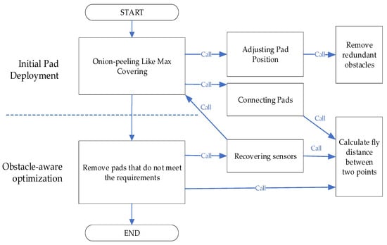 The section begins by defining the core optimization problem, outlining the objectives, constraints, and key variables such as energy capacity, flight range, and network connectivity. It then details the Onion-peeling like Max Covering (OLMC) algorithm, which guides the initial pad placement to guarantee full sensor coverage. Following this, the algorithm is re-executed to account for obstacle constraints, adjusting the pad configuration to satisfy connectivity requirements and obstacles restrictions.