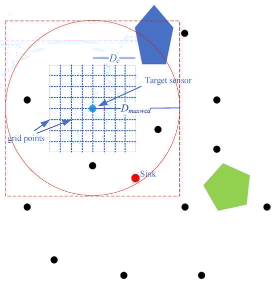 In the OLMC algorithm, the primary computation is the AdjPadPos function (Algorithm 3), which finds the optimal position for a new charging pad. It examines a square search area around a target sensor to find a location that maximizes the coverage of yet-uncovered sensors. As illustrated in Figure 2, the algorithm employs three spatial filtering mechanisms: (1) a circular LimitB region(red) with radius Dpad for preliminary sensor screening, (2) a bounding box (red dashed line) for obstacle pre-selection, and (3) a grid-based search space (gray dots) for precise positioning. This hierarchical filtering ensures only relevant obstacles (blue polygon) and sensors are evaluated. The time complexity of AdjPadPos is O(n).