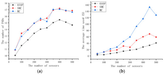 As shown in Figure 9b, for a smaller map size of 4096 × 4096, the execution time ranged from 0.29 to 41.55 s depending on the number of sensors and obstacles. In contrast, for the much larger 16,384 × 16,384 map, the execution time increased significantly, ranging from 2.71 to 159.51 s.