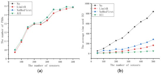 For example, with 50 sensors, using LimitB alone reduces execution time by 43.35 s (from 50.62 s to 7.27 s); with 500 sensors, the reduction reaches 673.9 s (from 836.63 s to 162.73 s). When combined with NoObsFirst, the execution time is further reduced—by 8.46 s (from 12.47 s to 4.01 s) with 50 sensors and by 231.28 s (from 280.80 s to 49.52 s) with 500 sensors.