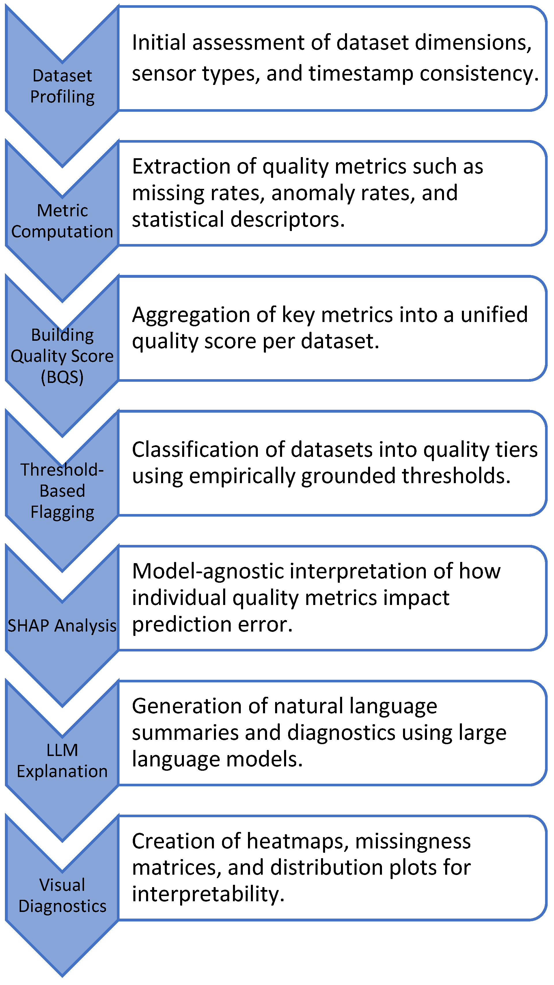 Data quality and validation for sensor time series | Profiling gaps, spikes, timestamp integrity, unit checks, dataset curation workflows | Descriptive defect statistics and rule outcomes | Taxonomy of defects and practical validation procedures | BQS formalizes quality as task-aligned components and links scores to downstream error | Indirect improvement via defect reduction prior to modeling | Typically narrative; no model-agnostic attribution to error |