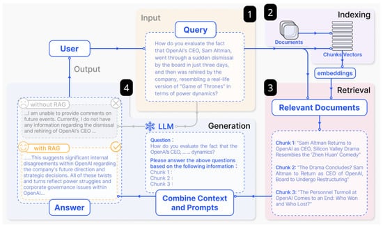 - Lewis, P.; Perez, E.; Piktus, A.; Petroni, F.; Karpukhin, V.; Goyal, N.; Küttler, H.; Lewis, M.; Yih, W.; Kiela, D.; et al. Retrieval-Augmented Generation for Knowledge-Intensive NLP Tasks. In Advances in Neural Information Processing Systems 33; Curran Associates, Inc.: Red Hook, NY, USA, 2020; pp. 9459–9474. [Google Scholar]