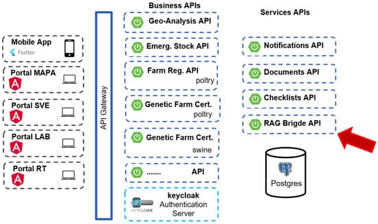As illustrated in Figure 3, the platform adopts a microservices-oriented architecture. The front-end comprises several specialized portals tailored for different stakeholders: the State Veterinary Service (SVE), technical managers (RTs), agricultural laboratories, and the Ministry of Agriculture (MAPA).