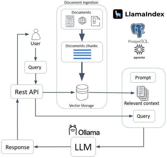 Figure 4 shows the general architecture of the system. The pipeline starts with document ingestion, where raw text is processed and converted into vector embeddings. These embeddings are stored in a PostgreSQL database using PGVector. When a user submits a query, the system retrieves relevant context from the vector database using LlamaIndex’s semantic search functions. The context is then passed to the LLaMA 3.1 model running via Ollama, which generates a response that is sent back through the API.