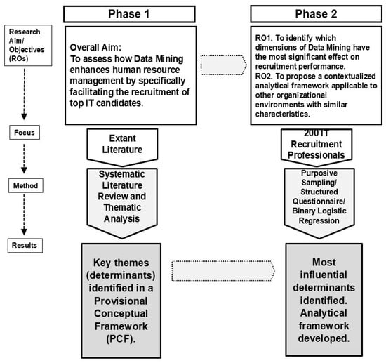 The present study is grounded in a rigorous hypothetico-deductive framework, aligned with the dominant paradigms in empirical research on digital HRM and data-driven decision-making [29,30]. This epistemological posture assumes that scientific knowledge is built through the testing of theoretically grounded hypotheses, formulated on the basis of a critical and systematic review of the literature [31,32]. The choice of this approach is justified by the study’s overarching objective: to evaluate the causal effect of data mining determinants on the success of IT recruitment in Moroccan digital-intensive firms. There were two main phases to the research process (Figure 1). In Phase 1, a systematic literature review, designed according to the PRISMA (Preferred Reporting Items for Systematic Reviews and Meta-Analyses) protocol, was undertaken, as recommended by Moher et al. [33]. From the literature analysis, a provisional conceptual framework was developed, which provided the basis for hypotheses generation and the primary research. Phase 2 empirically tested the hypotheses through feedback from 200 IT recruitment professionals. These two phases are discussed in more detail below.