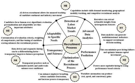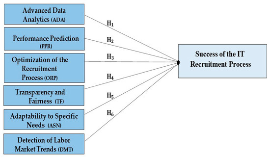 The key concepts in the PCF were adopted as the six determinants acting in complementary ways to reshape IT recruitment: ADA strengthens evidence-based selection, PPR reduces mismatches by forecasting performance, ORP improves efficiency, TF ensures ethical legitimacy, ABS aligns models with contextual requirements, and DTM provides strategic foresight. Collectively, they transform recruitment into a more data-driven, transparent, and adaptive process. From here, six hypotheses were postulated, exploring direct relationships between the main constructs (Figure 4). These hypotheses are: