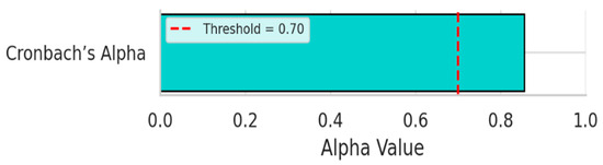 To assess the internal consistency and reliability among the explanatory determinants of a dependent variable, researchers in the social sciences commonly compare the estimated Cronbach’s alpha () to a conventional threshold of 0.70, as recommended by Nunnally [94] and supported by George and Mallery [95]. Thus, > 0.70 is generally considered indicative of acceptable reliability.