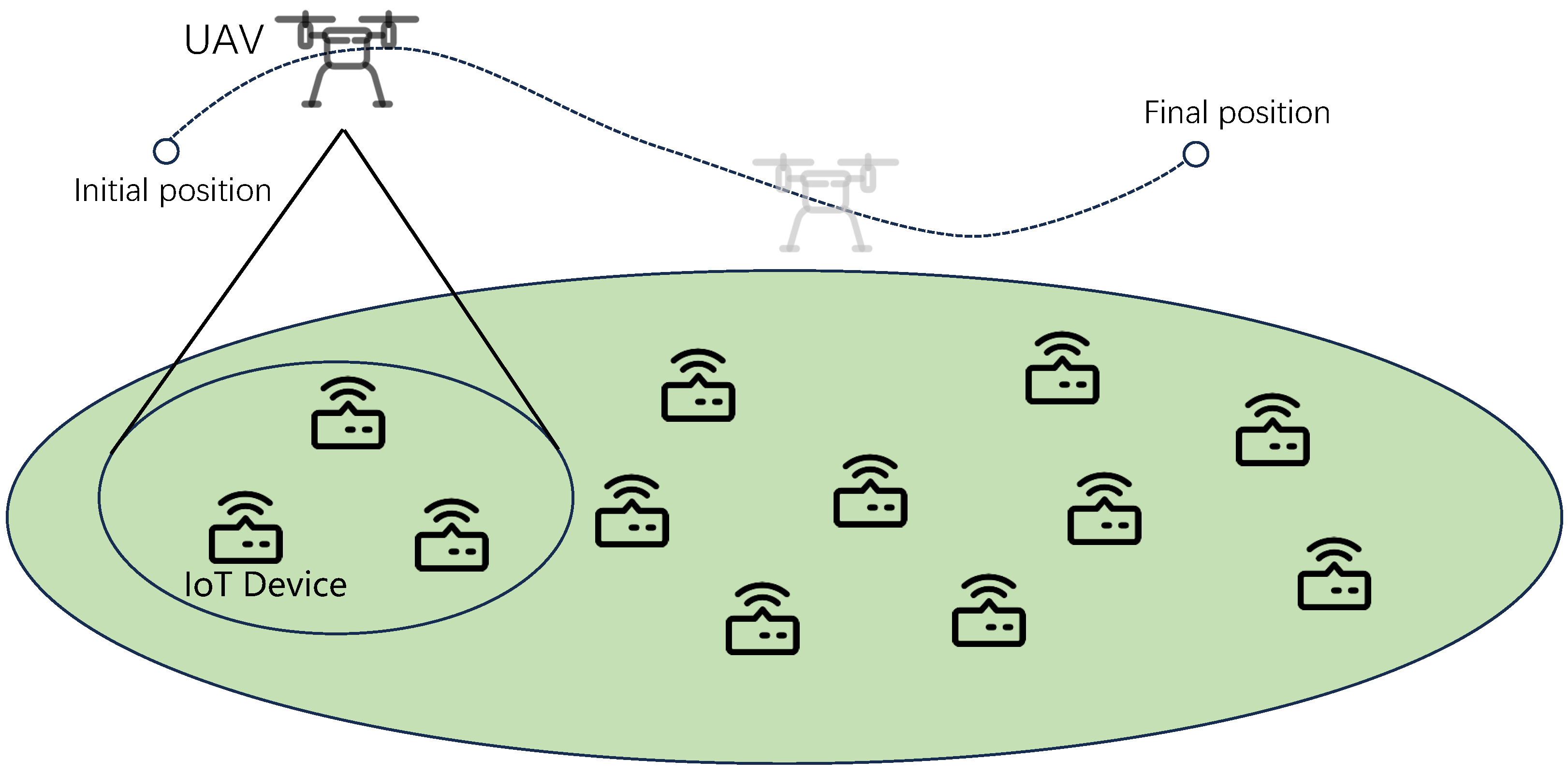 - We consider a UAV-assisted wireless powered IoT network in which IoT devices generate real-time data and require sustainable energy supply. A rotary-wing UAV equipped with a full-duplex hybrid access point (HAP) follows a fly–hover–communicate protocol to collect data from target devices and wirelessly charge surrounding nodes within its coverage.