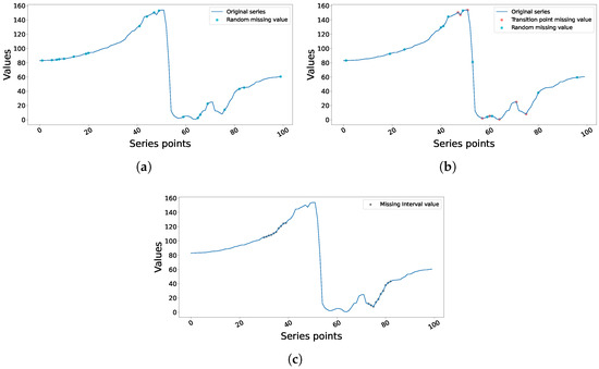- Block Missingness (Structured): We introduced blocks of contiguous missing values. For the purposes of sampling blocks, the total length of the time series T was conceptually divided into segments of . For each segment, we placed a block of a predetermined size (where was identified to approximate the total count of k across all blocks) starting from a random index within the limits of the segment. Again, all sample indices in these blocks were converted to missing in . In the case of overlaps in blocks or deviations in total segment length which deemed the total count < k (or >k), we made adjustments. Figure 2c depicts a sample of this dataset.