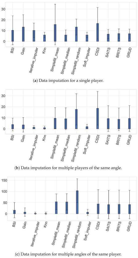 - Multivariate Context (Across Angles): For a given player p, we represent imputation as the data matrix . Algorithms that operate in the multivariate context can take advantage of inter-feature correlations, essentially learning about how various angles (kinematic variables) are related to the same subject over time.