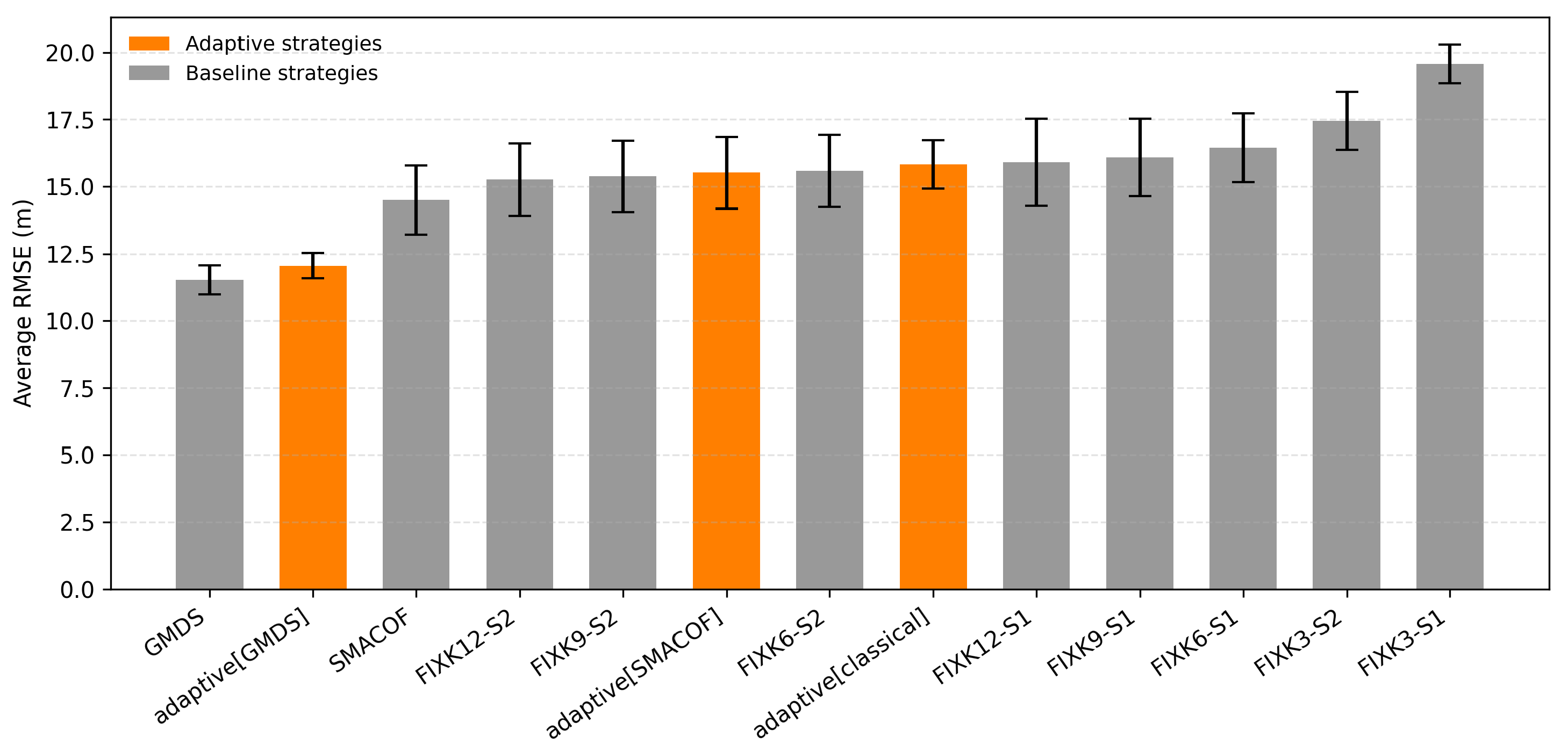 - Fixed-anchor MDS (FIXK). These approaches perform classical MDS alignment to a fixed set of anchors with known absolute positions. We evaluate variants with different numbers of anchors, FIXK3, FIXK6, FIXK9, and FIXK12, and two selection schemes: S1, where anchors are preselected based on a uniform spatial distribution, and S2, where anchors are chosen using a farthest-first criterion to maximize geometric diversity. During the simulation, the anchor set remains constant across all time windows, enabling a direct assessment of how anchor quantity affect accuracy and energy usage.