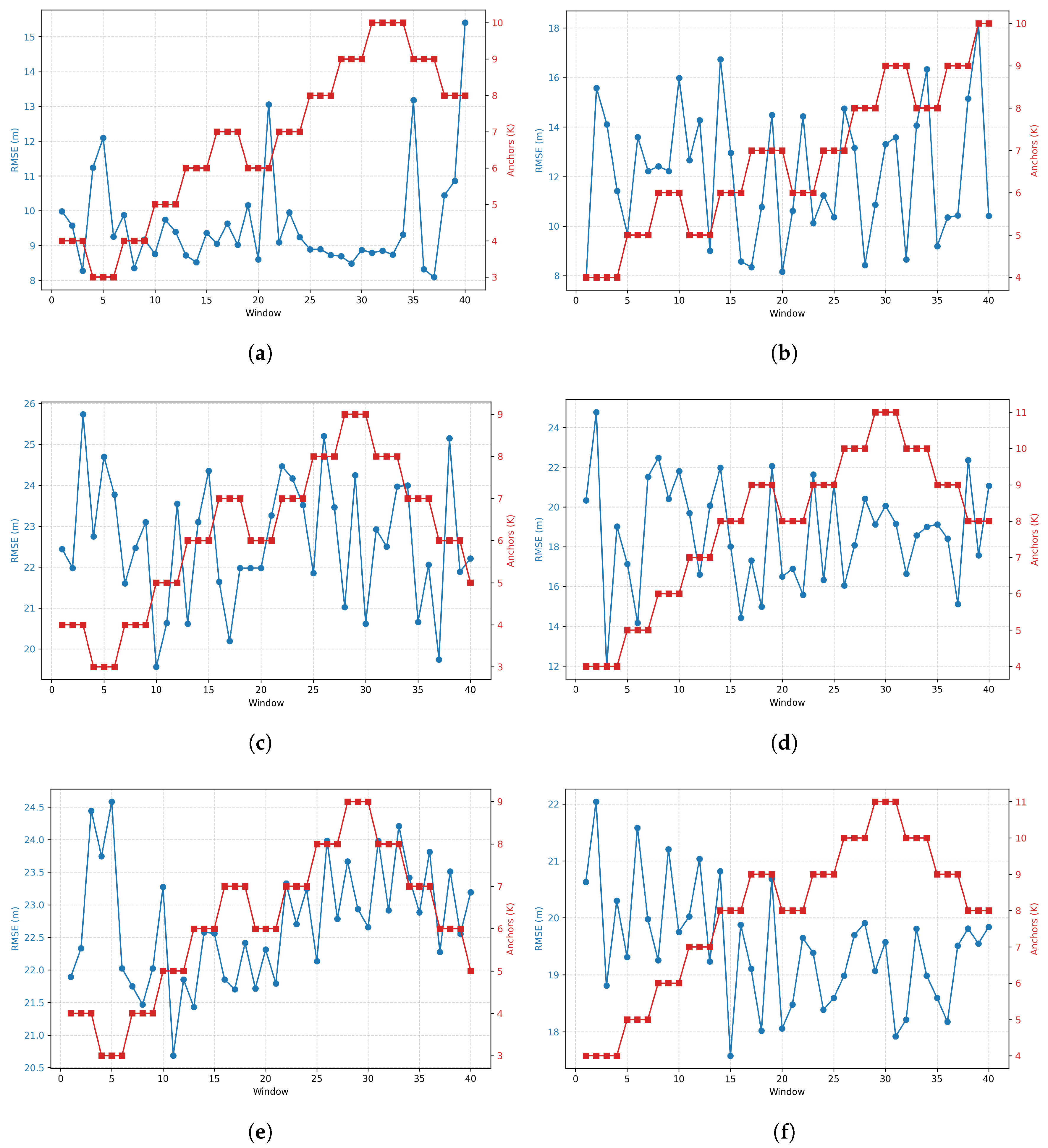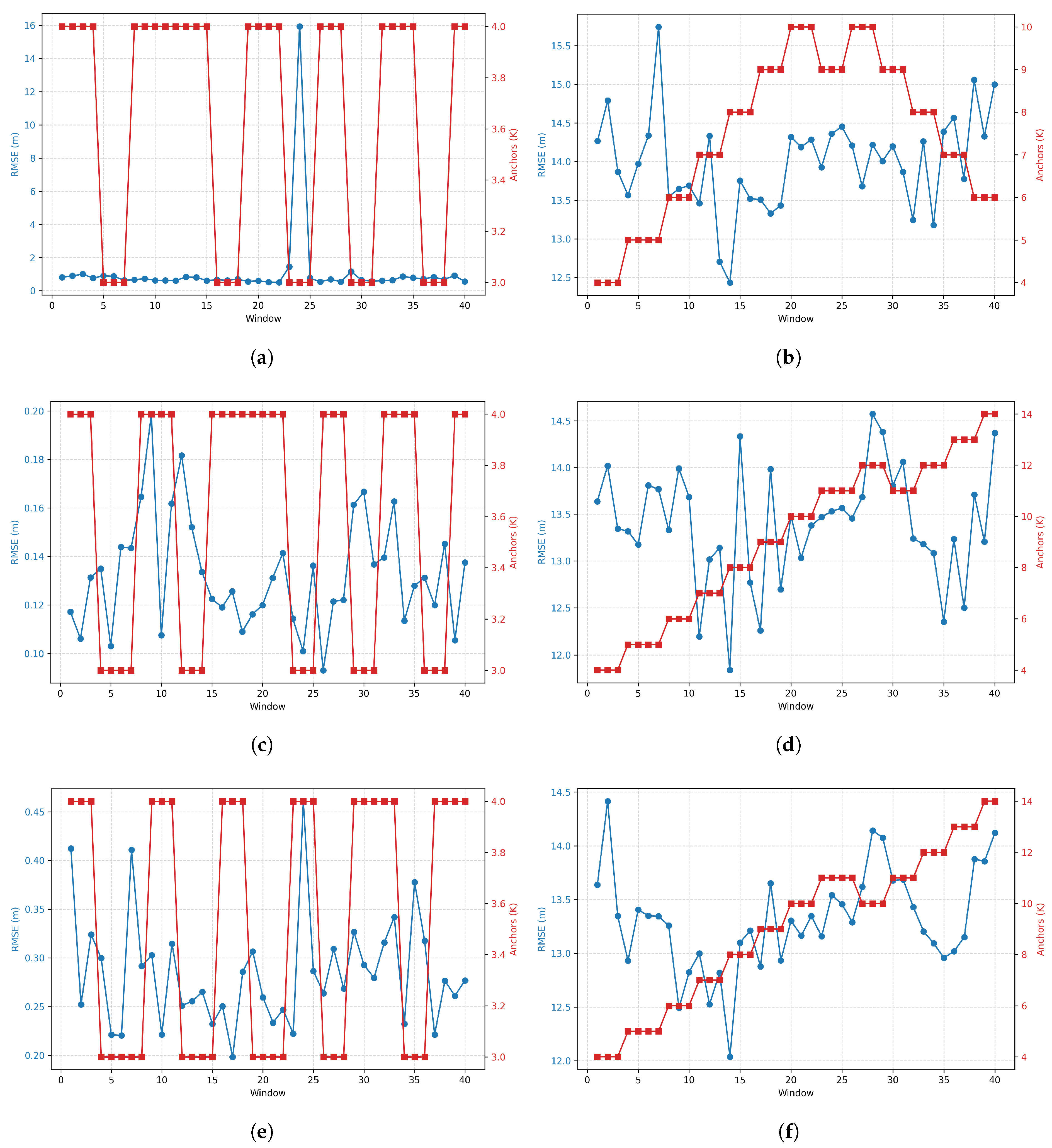 - Anchor configuration. The number and spatial distribution of anchors influence the accuracy of the Procrustes alignment and the resulting absolute position estimates. Simulations considered both fixed-anchor and dynamic-anchor configurations.