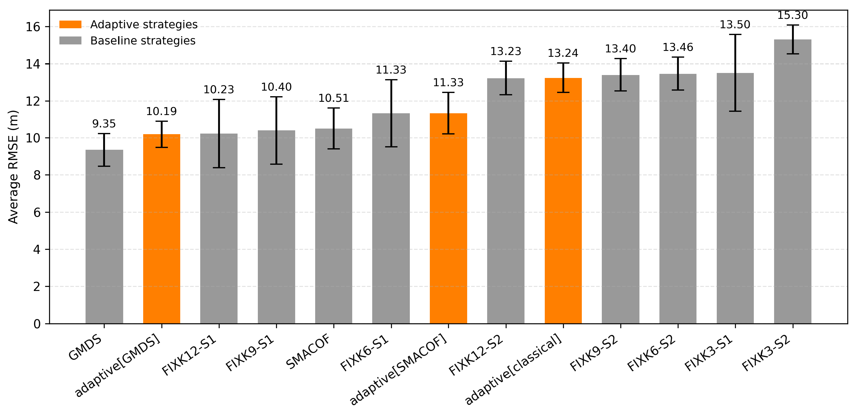 - Benchmark self-adaptive strategies. The proposed adaptive approach dynamically adjusts the number of active anchors and their selection based on recent localization performance and predefined hysteresis thresholds. To isolate the benefit of adaptive anchor control from the choice of the underlying position estimator, we also implement adaptive variants using SMACOF and classical MDS in place of GMDS. This enables a multi-dimensional comparison between static and adaptive anchor management, and between different estimation cores, but keeping identical mobility and noise conditions.
