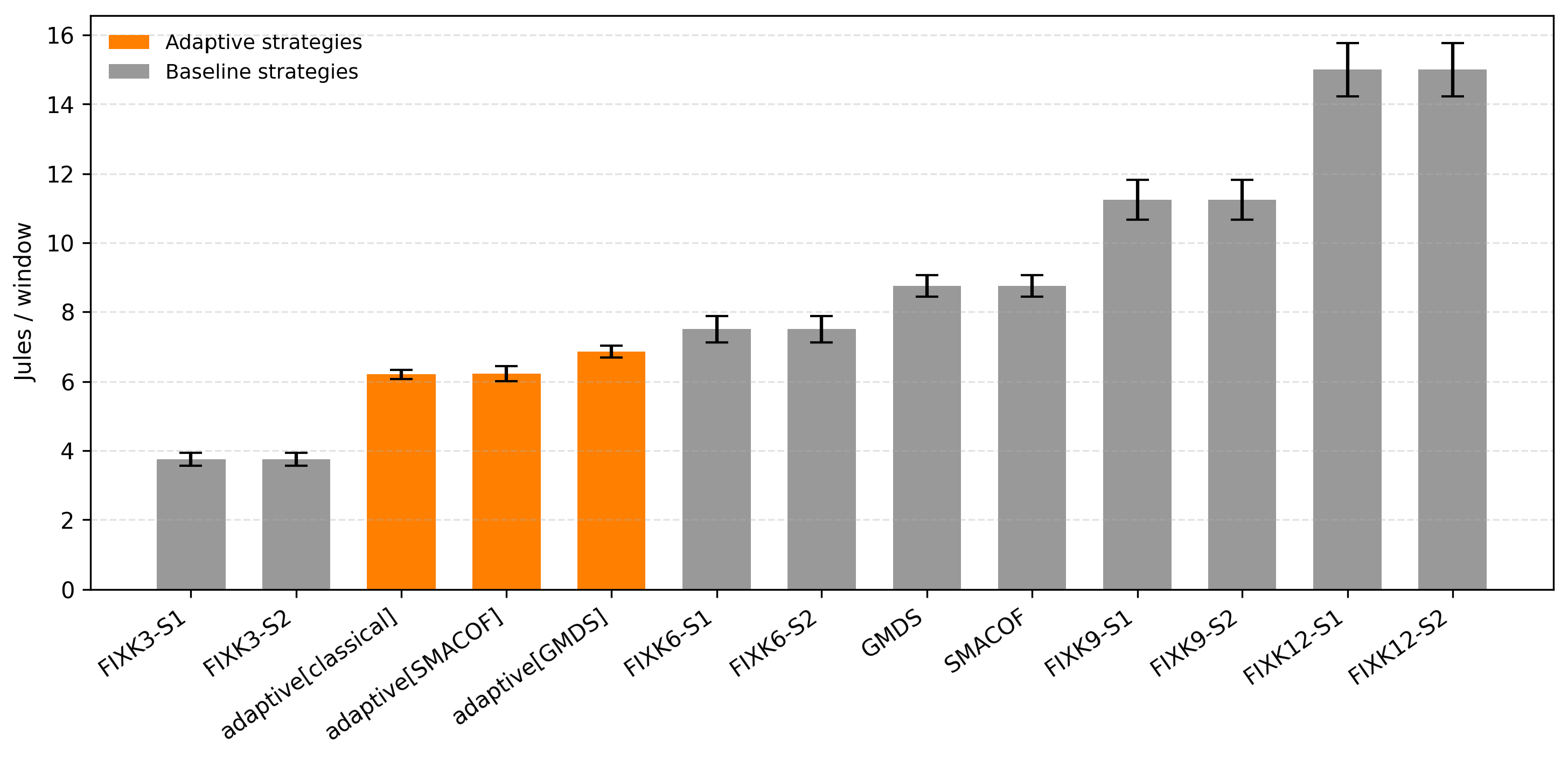 - Ultra-low-energy corner, composed by FIXK3. This strategy sits at 3.7 u but with a high RMSE, around 13 and 15 m. It can touch the extreme low-energy end of the front, yet it is far from optimal in accuracy; any practical budget above 4 J/window is better served by an adaptive strategy.